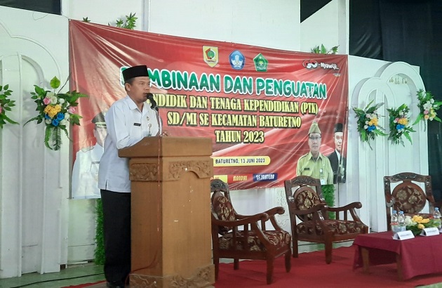 RILISJATENG.COM– Sinergisitas Kemenag Wonogiri dan Kecamatan Baturetno ditandai dengan adanya kegiatan “Pembinaan dan Penguatan Pendidik dan Tenaga Pendidik SD / MI Se-Kec. Baturetno Kab. Wonogiri”. Kepala Kemenag Wonogiri hadir sebagai Narasumber sekaligus memberikan sambutan dan pengarahan dihadapan 300-an peserta. Hadir juga Kepala Dinas Pendidikan dan Kebudayaan Kab. Wonogiri, Kepala PPKB dan P3A Kab. Wonogiri, Forkopimcab Kec. Baturetno, pengawas SD/MI, dan tamu undangan lainnya, kegiatan diadakan di RM Achmad dJayadi Baturetno pada hari Selasa (13/06/2023).